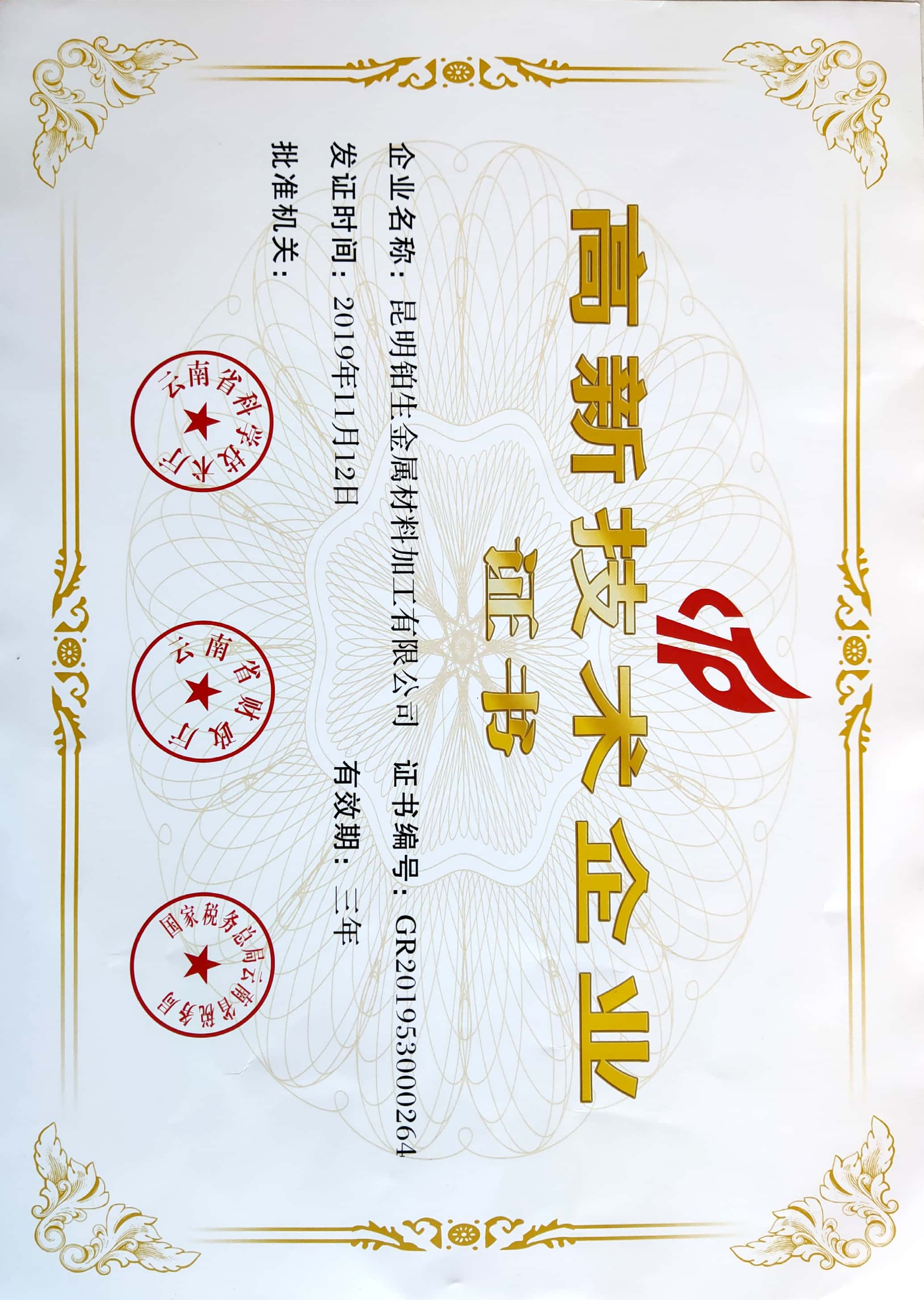 2016年铂生公司获得国家高新技术企业认定,成功研发出传感器专用铂粉并获得销售